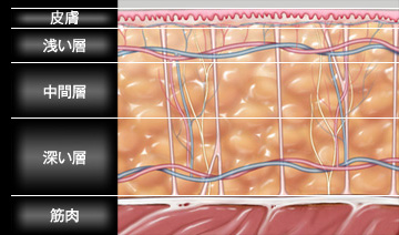 皮下の脂肪層は、その深さによって「深層」「中間層」「浅層」の三層に分類することができ、どの層からどの程度の量を吸引するかによって、仕上がりが微妙に違ってきます。